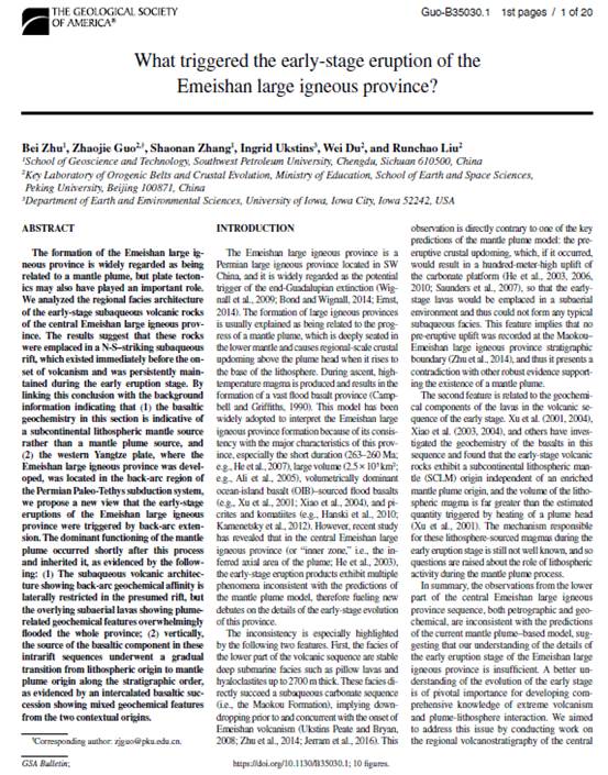 我院青年教師朱貝博士近日在國際權威地學期刊《Geological Society of America Bulletin》(美國地質學會會刊,簡稱GSA Bulletin)上發表了題為《What triggered the early-stage eruption of the Emeishan Large Igneous Province》的最新研究成果,為峨眉山大火成巖省早期噴發的起源機制提出了新的認識。