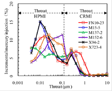 針對跨尺度納米——微米級孔隙的非常規儲層,高壓壓汞具有探測納米級(>3.6nm)孔喉的優點,得到孔喉半徑及分布。但是,該方法受到“pore-blocking”的影響,對大孔喉的反映造成影響。相比于高壓壓汞,恒速壓汞具有可以區分孔隙、喉道并分別計算得到孔隙、喉道分布的優點;但是,受有限壓力的限制(<6.2Mpa),該方法難以反映納米級(<0.12um)的孔喉;同時,巖心鑄體薄片顯示,恒速壓汞得到的孔隙半徑偏大,與實際不符。鑒于此,充分利用高壓壓汞與恒速壓汞的優點,得到了反映巖石納米——微米級跨尺度喉道分布特征。
