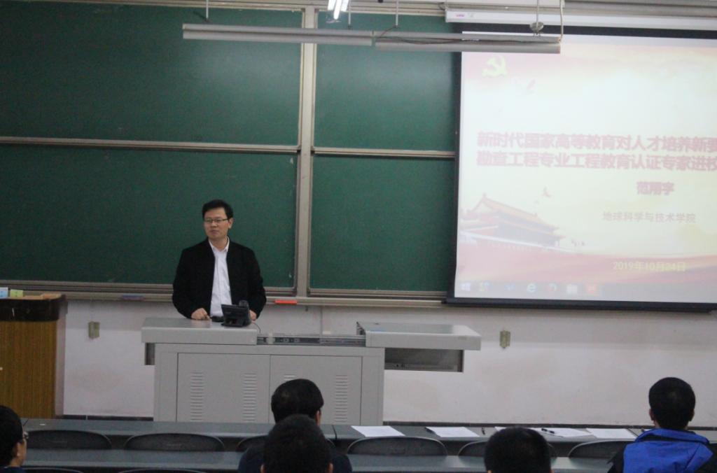 范翔宇副院長做了“新時代國家高等教育對人才培養新要求”專題報告,詳細闡述了國家近年來在抓好本科教育提高人才培養質量方面的新要求、新舉措;講解了中國工程教育認證的核心理念,并就資源勘查工程專業工程教育認證專家進校考察迎評工作進行了安排和部署。強調專業建設是學校的未來、學生的希望、教師的飯碗;抓本科人才培養和專業建設,任重而道遠,這既是我們的本職工作,又是一項良心工程;我們的使命是關愛學生、成就學生,為黨育人、為國育才,為培養德智體美勞全面發展的社會主義建設者和接班人而奮斗。