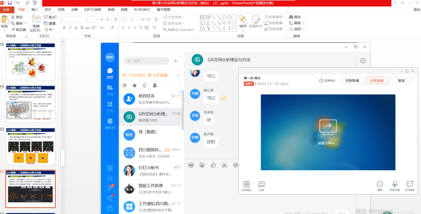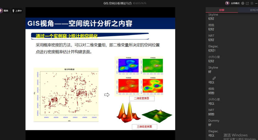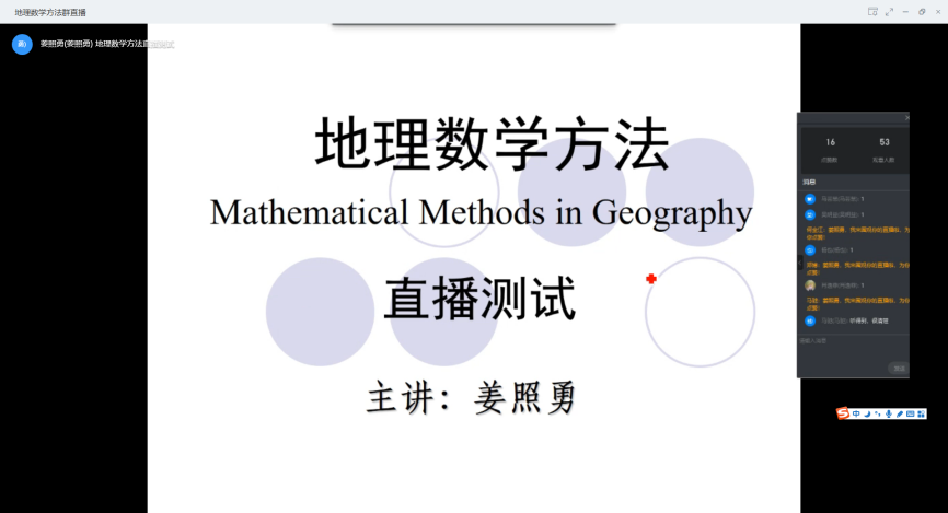 在網上教學方式上,對線上教學進行了教學設計,優化教學課件,增加了日常生活案例,將目前新冠病毒疫情空間分析案例引入課堂。在直播方式選擇上,廣泛聽取同學們的意見,結合自身實際選擇,準備了釘釘和QQ群課堂兩種教學直播方式,并將兩種方式都與同學們進行了測試。