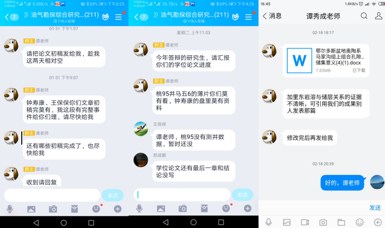 譚秀成教授通過電話連線、實驗室QQ群提醒、討論組語音通話等方式督促同學們學習,與學生展開學術交流的碰撞,耐心為學子答疑解惑。碩士生謝康在譚秀成老師的在線指導下完成了“鄂爾多斯盆地奧陶系……”等2篇文章的撰寫,準備投稿。團隊碩士生鐘壽康因過年回家沒帶硬盤,資料都在實驗室電腦里面,無法開展論文寫作,譚老師則擔起了從實驗室為學生快遞硬盤的任務。此外擔憂研究生畢業寫作進度并及時進行在線指導,譚老師更加注重對李明隆等5位碩士生以及蘇成鵬、羅思聰2位博士生的畢業論文指導,嚴把論文質量關,延期開學學位論文質量不打折。