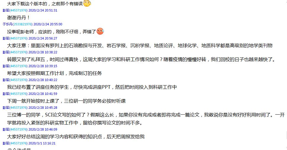 疫情無情,人間有愛。為最大限度減少疫情對研究生教育工作的影響,扎實推進疫情防控期間研究生的教育工作,地科院教師積極履行立德樹人的根本任務。在疫情期間,地科院李飛、彭軍、譚秀成、朱仕軍等多位導師要求實驗室團隊研究生嚴格按照學校要求不得提前返校,安心居家隔離學習,保護身心健康為第一原則,同時導師們紛紛利用網絡,云端在線指導研究生學習,延期不延教,保證疫情期間研究生培養質量不打折。