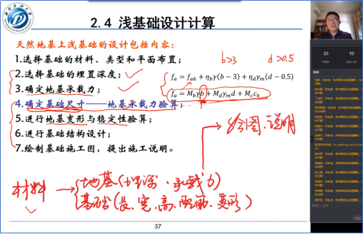 為了上好新課《地基及基礎》,張伯虎副教授綜合利用超星和中國大學MOOC平臺建立網課,采用釘釘直播+速課錄制進行課程講解,運用學習通進行教學管理與測試,綜合手段的利用讓學生選擇余地更大,學習時間更加靈活。直播課堂上,張老師跟學生無話不談,經常停下來回答學生的問題。一張PPT上畫足了記號;一張白板,公式推導一目了然。教學實施中,通過學習通簽到、投票、測試、作業、通知和討論等,讓學生學習不再枯燥。