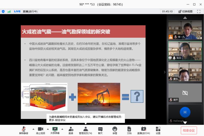 朱貝老師在科研方向專攻火成巖石學和巖漿作用演化,近年來四川盆地火山巖油氣藏獲得重大突破的事實,彰顯了火成巖的儲集潛力。朱貝老師針對此而立意,在公開課上,系統梳理了火成巖相關原理與油氣勘探的有機結合,展望了火成巖油氣勘探的前景,并結合自身針對峨眉山大火成巖省起源的研究理論,探討了二疊紀東特提斯洋俯沖對地幔柱事件的貢獻,以及該構造事件對四川含油氣盆地二疊系構造格局潛在的約束意義。