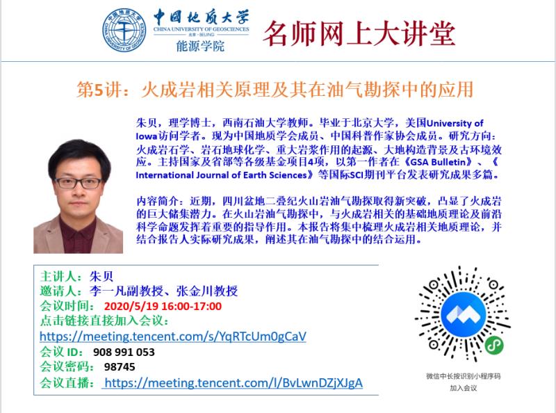 5月19日,受中國地質大學(北京)能源學院張金川教授、李一凡副教授邀請,我校地科院青年教師朱貝在中國地質大學(北京)“名師網上大講堂”開展了題為《火成巖相關原理及其在油氣勘探中的應用》的網絡公開課。課程面向全國高校及公眾在網絡平臺同步播出。