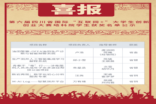 7月6日,西南石油大學第六屆“互聯網+”大學生創新創業大賽在云端拉開帷幕。進入校賽的項目經過自主申報、專家在線初審和校賽終審,我院的隊伍在校賽中獲2項金獎、4項銀獎和14項銅獎。經過校賽的選拔,7月31日,我院5支隊伍代表學校參加四川省第六屆“互聯網+”大學生創新創業大賽,獲得省金獎1項、銀獎2項、銅獎2項。
