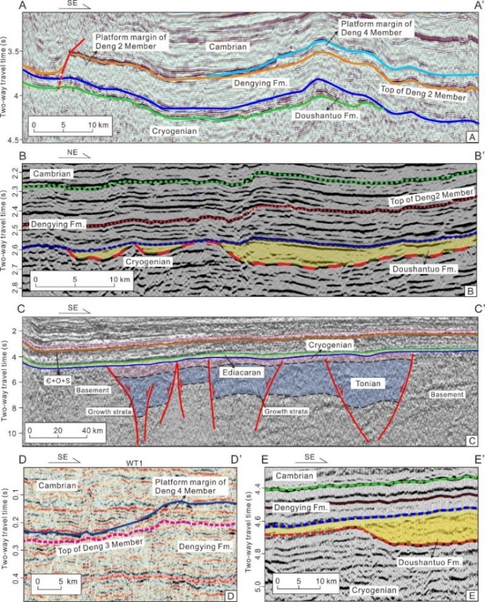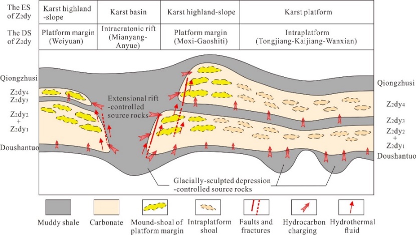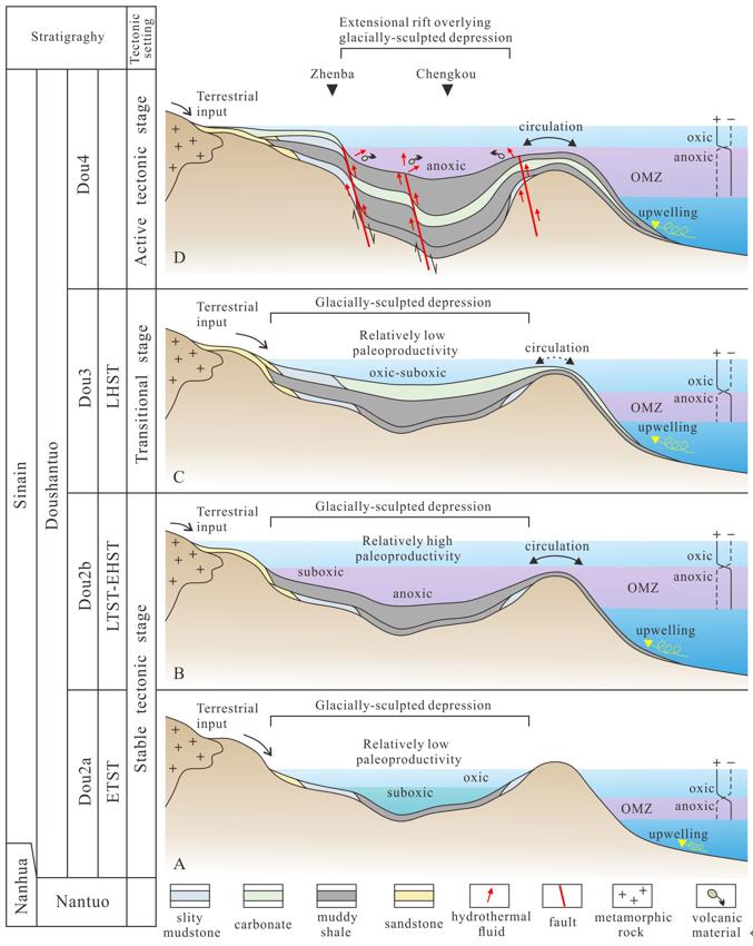 結果表明,新元古代冰期后烴源巖可能普遍具有較好的生烴潛力,且局部地區處于適宜埋藏與熱演化階段,已經或正在生排烴并形成工業性油氣聚集,如在俄羅斯西伯利亞、阿曼Salt盆地、印度和巴基斯坦等地區都發現了與這套烴源巖有關的油氣系統。在四川盆地陡山沱組,烴源巖的分布在時空上受Marinoan冰期刻蝕與拉張裂陷作用的共同控制,地震剖面顯示南沱冰期古地形對陡山沱組地層厚度和巖相變化起到了控制作用(圖1)。Marinoan冰期后的有機質富集主要可能與海侵過程中上升流引起的高古生產力和缺氧有關(圖2);整個華南地區冰川融化滯后效應與陸源稀釋效應造成不同區域有機質差異富集,發育多個條帶狀分布的陡山沱組烴源巖沉積中心,可望具有較好的油氣勘探前景(圖3);陡山沱組可能存在成烴貢獻,特別是不同區域拉張裂陷槽與冰川刻蝕槽控制成藏具有差異性,決定了油氣生儲組合與充注效率(圖4)。