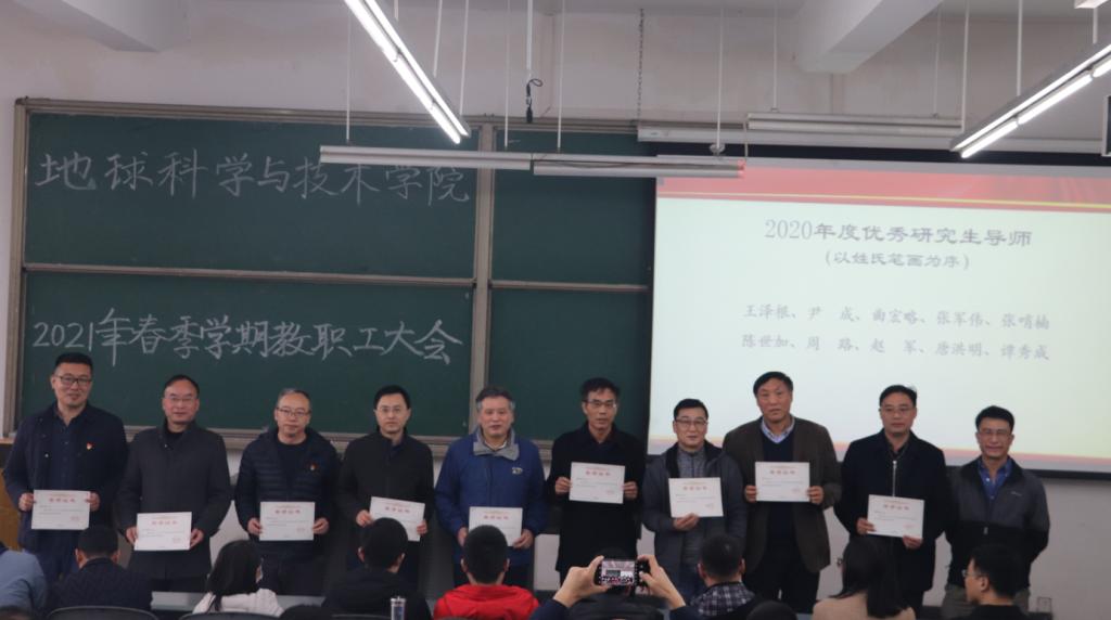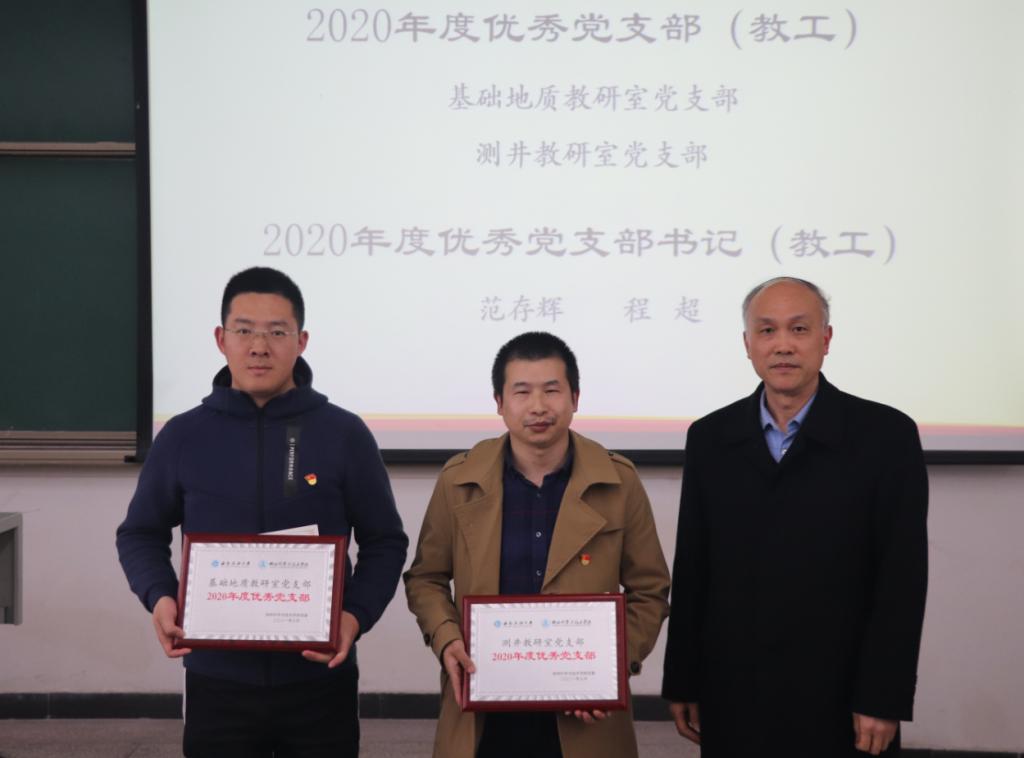 院黨委副書記范起東宣布了2020年度考核優秀的單位以及個人。學院王興志等31人榮獲2020年度教職工考核“優秀”等級;基礎地質教研室、物探教研室榮獲2020年度優秀教研室;王澤根等10人榮獲2020年度優秀研究生導師;基礎地質教研室黨支部、測井教研室黨支部獲得2020年度優秀黨支部;范存輝、程超榮獲2020年度優秀黨支部書記;曲宏略等19人榮獲2020年度優秀共產黨員。學院黨委書記朱江、院長黃旭日、副院長范翔宇、副院長劉宏分別為獲獎單位和個人頒獎。
