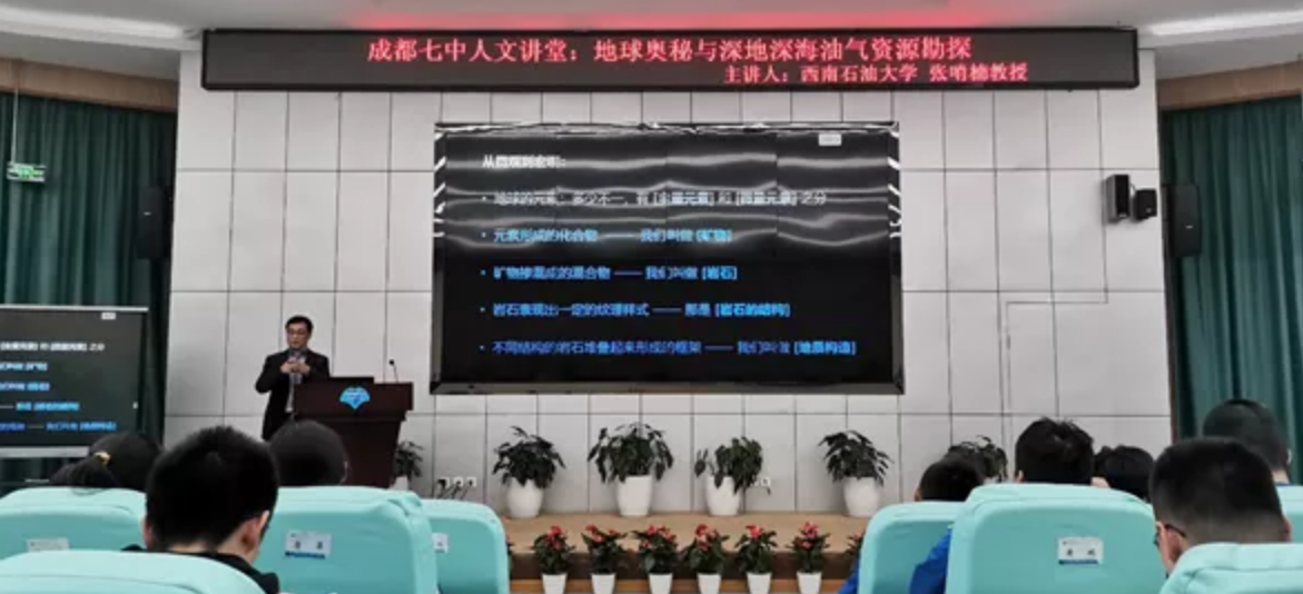 4月12日,成都七中建校116周年校慶之日,招生就業(yè)處組織的《“能源有你”科普講座進(jìn)中學(xué)系列活動》進(jìn)入成都七中(林蔭校區(qū))。我院張哨楠教授作為主講嘉賓為成都七中高一年級6個班級200余名同學(xué)作了題為“地球奧秘與中國油氣資源”的科普講座。