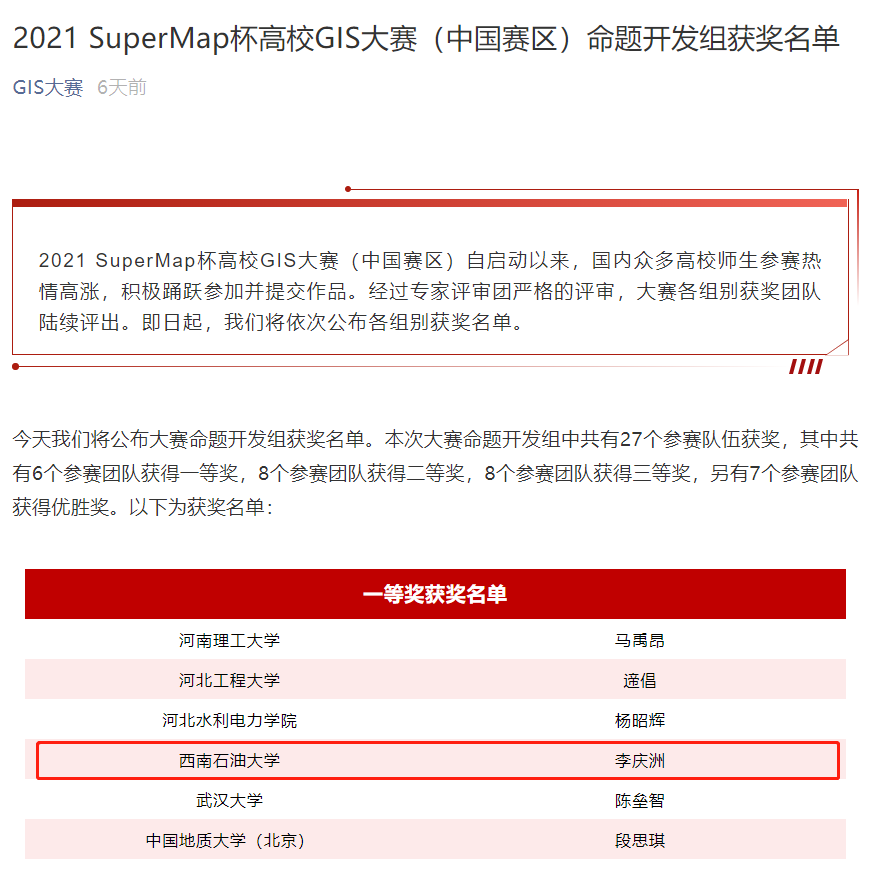 “SuperMap杯高校GIS大賽”命題開發組一等獎獲獎名單
