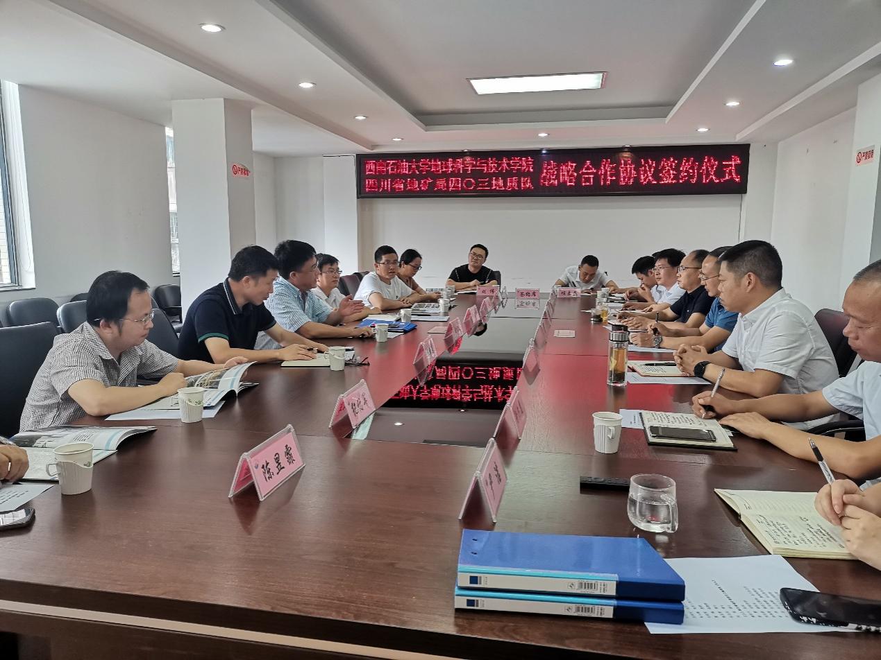 黃旭日院長感謝四〇三地質(zhì)隊的熱情接待,他簡要介紹了西南石油大學(xué)地球科學(xué)與技術(shù)學(xué)院的發(fā)展歷史、學(xué)科建設(shè)、人才隊伍、科研成果等情況。黃旭日表示,四〇三地質(zhì)隊業(yè)務(wù)范圍與我院各專業(yè)契合度高,期待整合我院優(yōu)勢的科技研發(fā)平臺和四〇三地質(zhì)隊海量的地質(zhì)基礎(chǔ)數(shù)據(jù),發(fā)揮1+1大于2的優(yōu)勢,建立廣闊深入的長效合作機(jī)制。