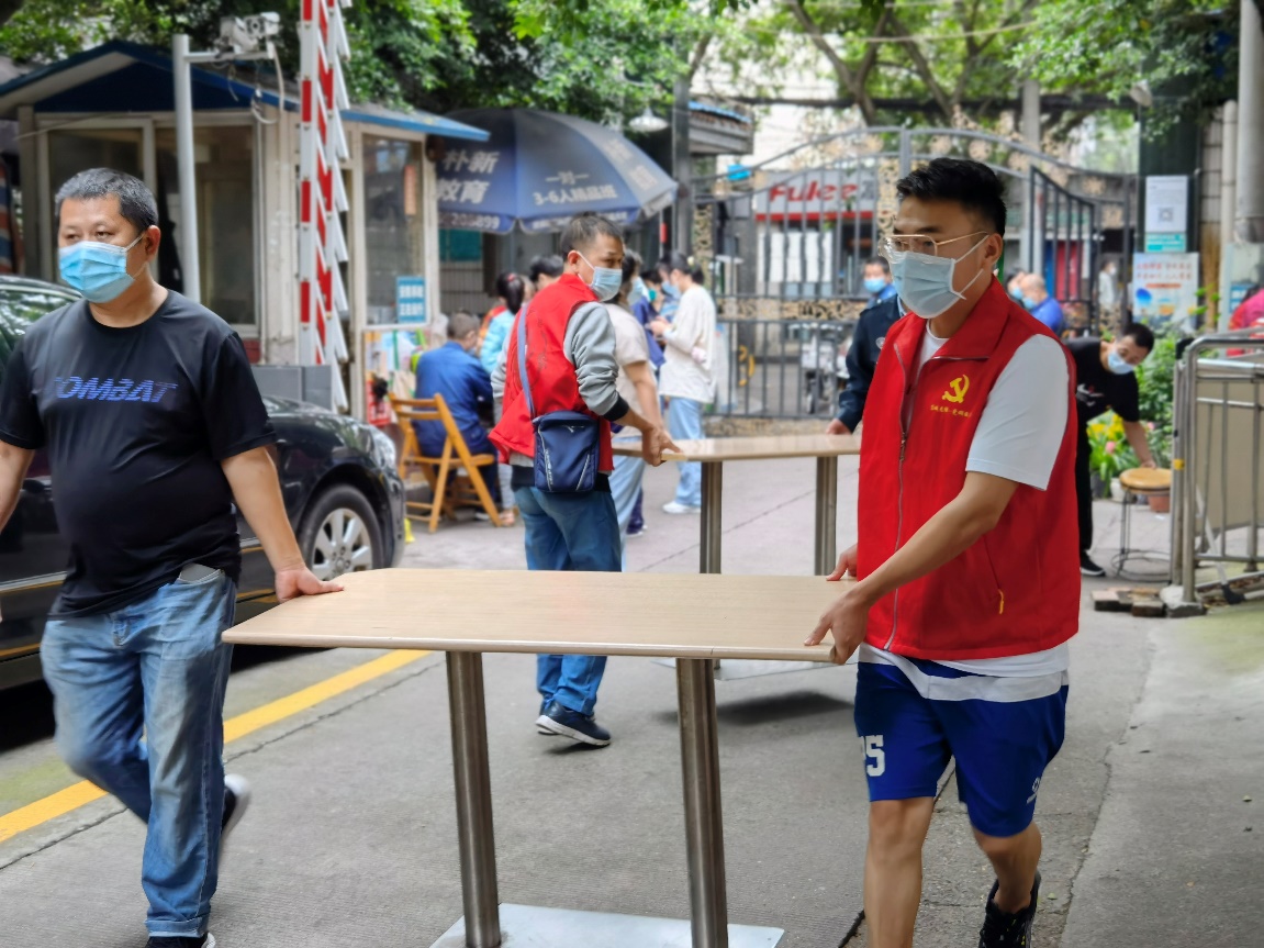 搬運核酸檢測點位所需物資(右一為歐陽田)