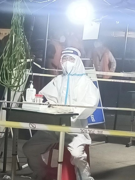 教工黨員文雪,丟下剛上小學一年級在家上網課的孩子,主動請命擔任志愿者,積極投身抗疫志愿服務,穿上防護服,奮戰在核酸信息采集的最前線,負責核酸檢測信息采集,分裝、分發核酸采集工具等工作。