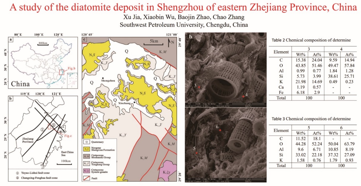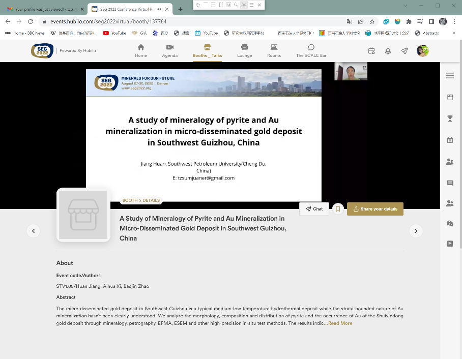 會議期間,趙寶金教授、張超和賈旭博士分別在礫巖型金礦、草莓狀黃鐵礦和磷灰石、浙江硅藻土礦等研究方向作了展板,姜歡博士在郗愛華教授的指導下參加了“下世紀的重要金屬”專題匯報,作了題為“A study of mineralogy of pyrite and Au mineralization in micro-disseminated gold deposit in Southwest Guizhou, China”的線上報告,并在Q&A環節與參會專家學者進行了廣泛的研討交流。