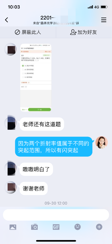 對于教師,可以通過慕課堂學(xué)情分析了解每位同學(xué)課堂表現(xiàn)及答題分布情況。學(xué)生也可以通過QQ群聊天、留言等方式向老師提問(圖6)。