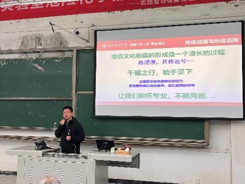 會上,教研室主任汪宙峰、黨支部書記王成武圍繞活動主題,從地信行業(yè)的現(xiàn)狀與問題、地理信息教研室概況和地信文化三方面展開做了精彩的PPT匯報。汪宙峰老師從國家“十四五”規(guī)劃中地信行業(yè)需求、國家新時期地理信息有關重大工程、GIS理論和技術前沿發(fā)展、GIS人才需求及就業(yè)現(xiàn)狀等方面闡述了未來地信行業(yè)的發(fā)展趨勢以及機遇。培養(yǎng)德才兼?zhèn)涞膸熒瞬判枰宋暮蛯I(yè)文化底蘊的支撐,黨支部書記王成武老師詳細介紹了地信教研室“大地無垠智信空間”室訓,“厚德仁愛同心求進”的地信文化與地信精神,并提出以時間和全體師生的奮斗來沉淀地信專業(yè)的文化底蘊,打造獨一無二的地信品牌。