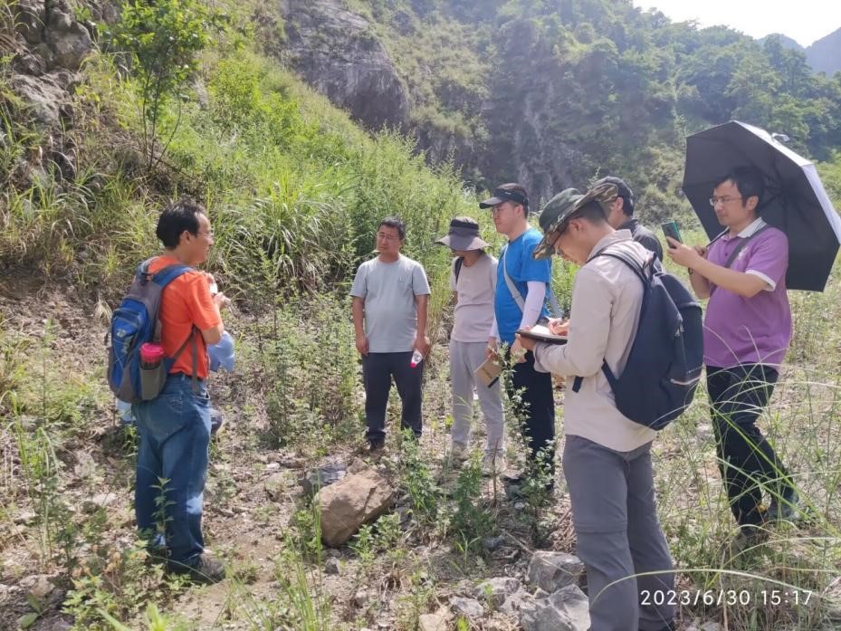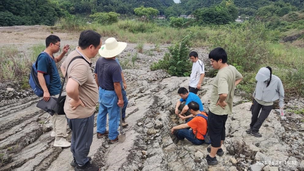 6月28日下午,實(shí)習(xí)隊(duì)教師一行來到峨眉山市羅目鎮(zhèn)魚田壩開展教學(xué)研討工作,重點(diǎn)考察中三疊統(tǒng)雷口坡組。王興志老師系統(tǒng)的給中青年教師講解雷口坡組的沉積環(huán)境、巖石組合和各種典型沉積結(jié)構(gòu)構(gòu)造。雷口坡組記錄了多個(gè)完整連續(xù)的海侵-海退旋回,各種沉積結(jié)構(gòu)和構(gòu)造十分典型,如干裂、雨痕、同生角礫、膏溶角礫、藻疊層、網(wǎng)格狀節(jié)理等。