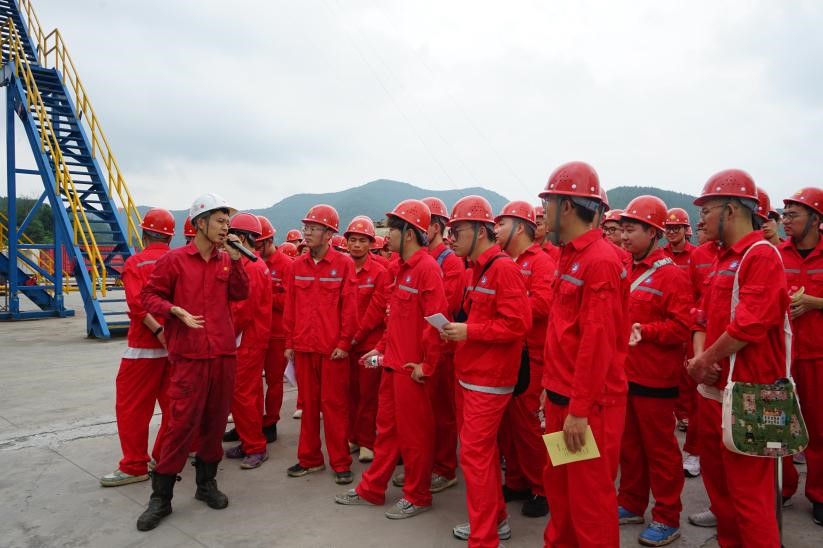 同學們到達井場后,受到中石油西南油氣田公司勘探事業部和中石油川慶鉆探公司90025鉆井隊的熱情接待。首先在井場外由90025鉆井隊田清江隊長對同學們進行了入場安全教育,然后中石油西南油氣田公司勘探事業部汪曉星及蓬深6井項目經理劉強分別給同學們介紹了蓬深6井的基本情況以及地質背景。隨后同學們分批進入蓬深6井井場,由鉆井隊鉆井技術員、泥漿技術員、地質技術員分別介紹了井場基本布局、地面管匯、鉆機類型及裝備情況、鉆機的主要構成、地面固控設備、泥漿循環系統、地質錄井流程等。