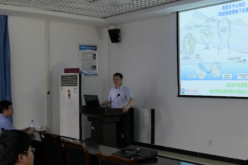 范翔宇隆重介紹了胡教授,并代表全院師生對胡教授的蒞臨表示熱烈的歡迎。胡教授從頁巖油氣高效開采、綠氫地質儲存、高放核廢物地質處置等多個領域入手,并基于美國核廢物地質處置項目及中美頁巖油氣開采工作,圍繞低滲介質和裂縫雙重體系的影響,從基質納米孔隙連通性與基質-裂縫相互作用出發,應用自主開發的互補性納米巖石物理等研究方法,為大家深入的講解了其中關于理論與手段的創新性等內容。此外,還特別強調了環境與能源的歷史進程,從而引出地下存儲系統,并介紹了中石化漢江巖穴儲氣庫的運作模式。胡教授講授的內容引起了大家的共鳴,大家進行了深入的交流。