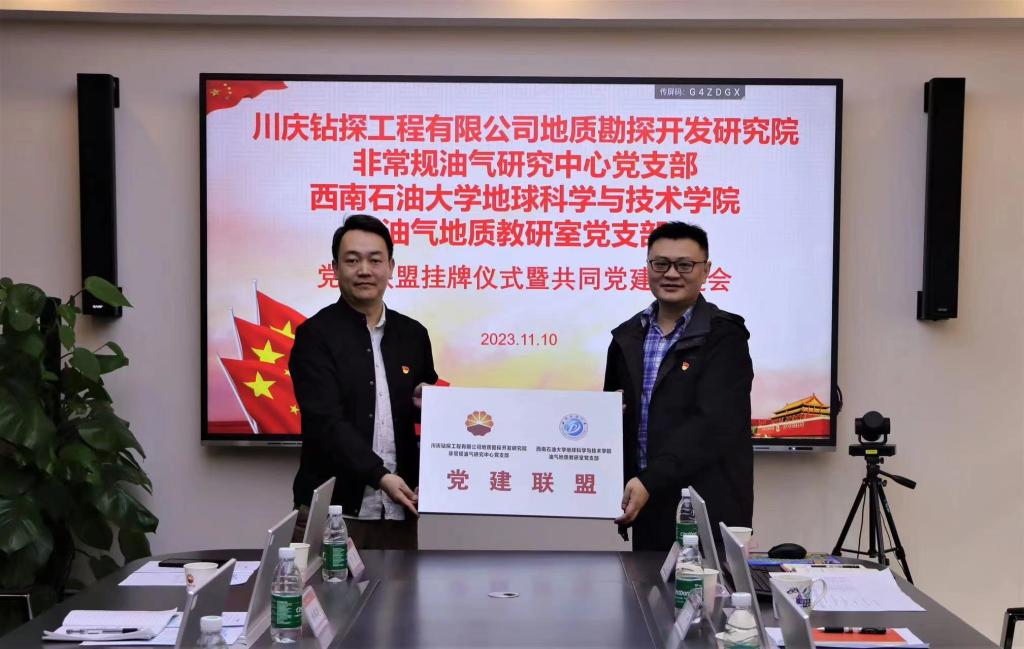 我院油氣地質教研室黨支部積極探索新時代基層黨支部建設,在學院黨委領導指導下、川慶地研院黨委領導大力支持下,油氣地質教研室黨支部與地研院非常規油氣研究中心黨支部進行多次深入交流,最終確立開展共建合作、建立黨建聯盟,并于2023年11月10日在川慶地研院隆重舉行了“黨建聯盟掛牌儀式暨共同黨建促進會”。
