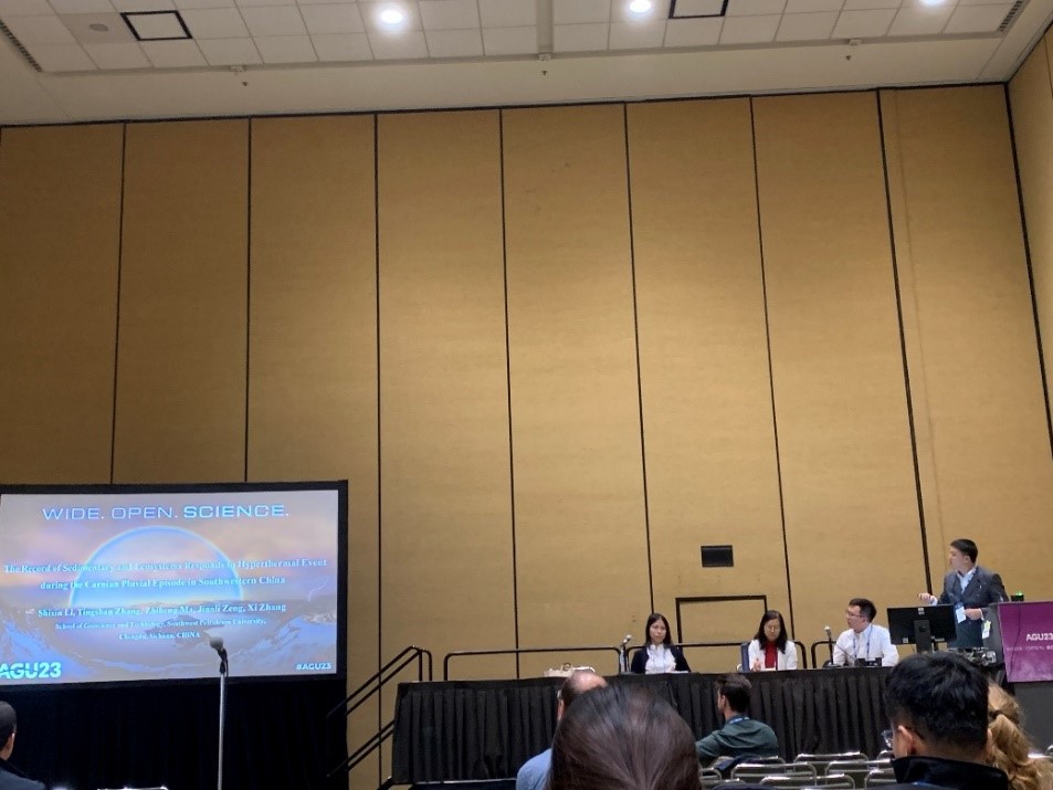 我院張廷山教授課題組李世鑫博士生在會議專題PP53A(中生代-古新世高溫事件期間的氣候變化和極端環(huán)境),作了題為“The Record of Sedimentary and Ecosystems Responds to Hyperthermal Event during the Carnian Pluvial Episode in Southwestern China”口頭匯報,介紹了晚三疊世極端氣候環(huán)境下我國華南地區(qū)碳酸鹽巖臺地沉積演化過程及生態(tài)響應(yīng),并與參會專家進(jìn)行了廣泛的研討交流,為國內(nèi)外專家理解全球晚三疊世極端氣候事件過程和環(huán)境-生物協(xié)同演化關(guān)系提供了重要參考,進(jìn)一步為加強(qiáng)我校國際學(xué)術(shù)交流與合作以及擴(kuò)大學(xué)術(shù)影響力起到了良好的助推作用。