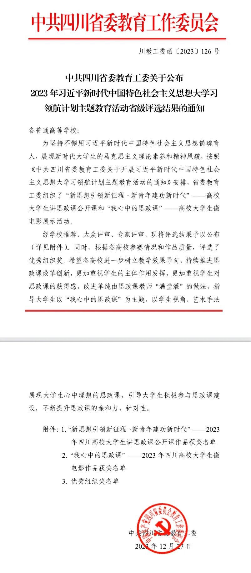 近日,由中共四川省委教育工委組織開展的2023年習近平新時代中國特色社會主義思想大學習領航計劃主題教育活動評選結果公布,學院作品《無名》在眾多參賽作品中脫穎而出,榮獲“我心中的思政課”2023年四川高校大學生微電影作品特等獎(學校唯一,全省10個)。