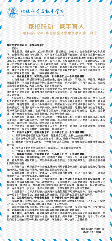 《地科院2024年寒假致全體學(xué)生及家長(zhǎng)的一封信》