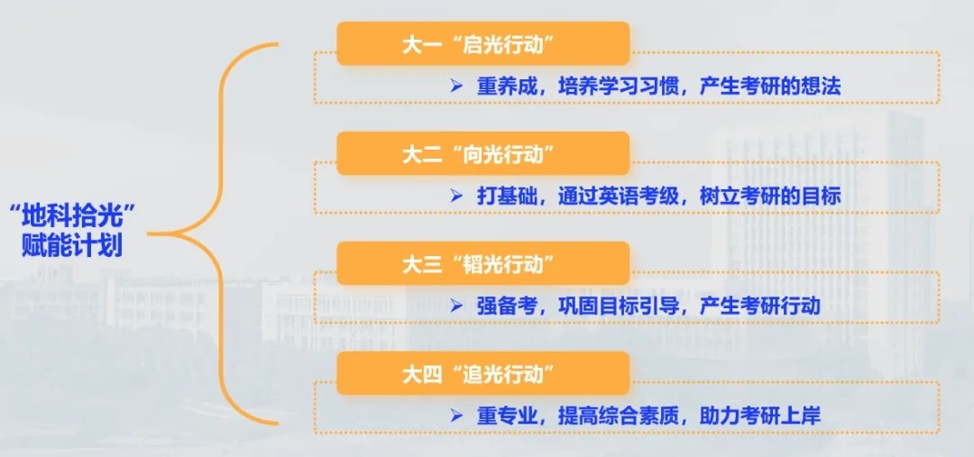 地科院從大一到大四,不間斷為所帶學生開展10余場職業生涯規劃,精準摸排學生畢業去向,為每名學生“量體裁衣”。扎實推進“地科拾光”賦能計劃,大一“啟光行動”重養成,培養學習習慣,產生考研想法;大二“向光行動”打基礎,通過英語考級,樹立考研目標;大三“韜光行動”強備考,鞏固目標引導,產生考研行動;大四“追光行動”重專業,提高綜合素質,助力考研上岸。