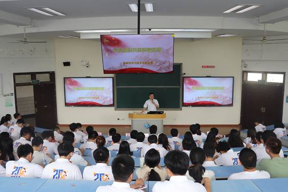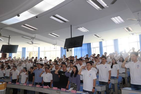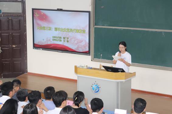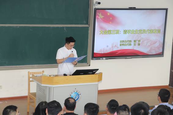 本次大會在全體師生奏唱中華人民共和國國歌中熱烈拉開帷幕,激昂磅礴的歌聲響徹整個會場。李明科老師介紹參會領導和嘉賓后,畢業生黨員代表上臺發言。本科生代表潘廣宇以“燃青春之火,耀黨員過去之恩、當下之責、未來之任”為主題進行發言,研究生代表劉瑜就自己的經歷、感悟進行分享。兩名黨員代表的發言中均表達了自己對黨、對母校、對老師和同學深深的感激之情,并表示今后踏入社會定會牢記自己的黨員身份,強化自身黨員責任意識,為黨和國家的建設與發展貢獻力量,為母校增光添彩。