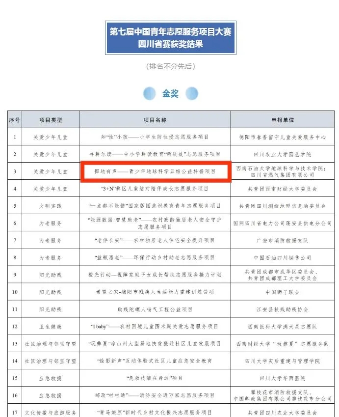 第七屆中國青年志愿服務項目大賽四川省賽金獎項目名單