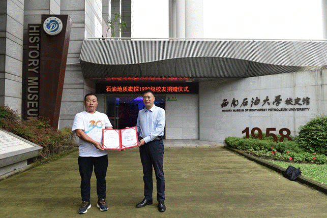 捐贈儀式上,李德海代表學校接受石油地質勘探1990級校友代表曾代友的捐贈,并向校友代表頒發捐贈證書。黃旭日為校友代表贈送地科院訂制的“燦若星辰”紀念品表達感謝和敬意。