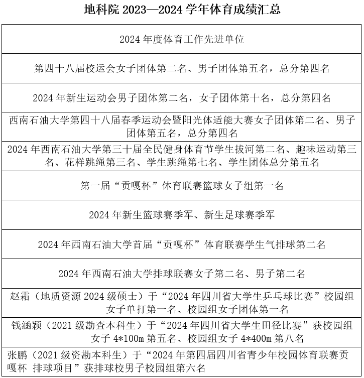 學院歷來高度重視學生體育運動,秉承“五育并舉”育人理念,強化“以體育人、以體育心、以體育德”,促進學生全面發(fā)展。2023-2024學年度地科學生在各大體育賽事中,捷報頻傳,成績斐然。