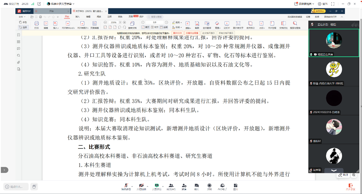 2025年1月24日下午,“第九屆全國(guó)大學(xué)生測(cè)井技能大賽”西南石油大學(xué)賽區(qū)專項(xiàng)技能培訓(xùn)啟動(dòng)會(huì)通過視頻會(huì)議方式召開,會(huì)議由測(cè)井教研室巫振觀老師主持。測(cè)井教研室教師代表、報(bào)名參加大賽的研究生和本科生共計(jì)四十余人參加大會(huì)。