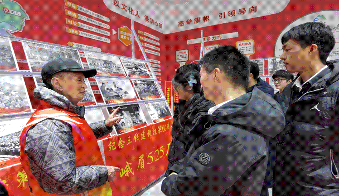參觀中,師生黨員認真學習了成昆鐵路峨眉段、七三九、六七廠、峨眉水泥廠、五二五廠、礦機廠等單位三線建設的歷史,聆聽了“實干骨干”劉吉祥、汽車廠先進老工人馮友明等老一輩工人們煉制鎢鋼、克服重重阻力生產汽車、冒著風雨建設成昆鐵路峨眉段的奮斗故事,從中汲取前進動力與精神力量。“