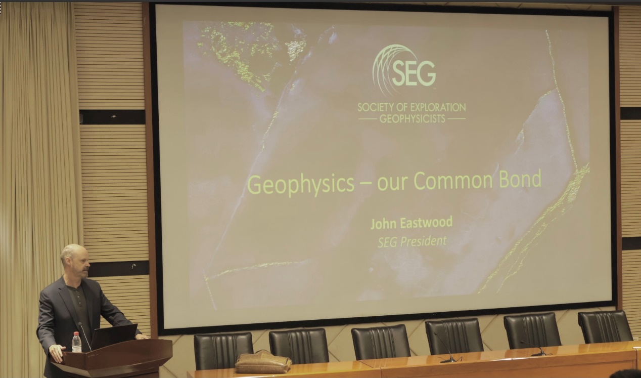 John Eastwood先生在思學(xué)樓以“地球物理學(xué):我們共同的紐帶”為主題進(jìn)行學(xué)術(shù)報(bào)告。SEG協(xié)會中國區(qū)辦公室總經(jīng)理吳靜宇,西南石油大學(xué)國際處處長戴磊,地科院院長黃旭日,副院長劉宏等出席會議。報(bào)告以“什么是SEG”為切入點(diǎn),介紹了該國際性學(xué)術(shù)組織的主要工作,包括出版刊物、舉辦年度技術(shù)會議、全球研討會,以及教育服務(wù)和旅行資助等項(xiàng)目。John先生特別指出,SEG的使命是“服務(wù)科學(xué)、服務(wù)會員、服務(wù)社會”,致力于尋找可持續(xù)、可靠且經(jīng)濟(jì)的能源和資源解決方案。