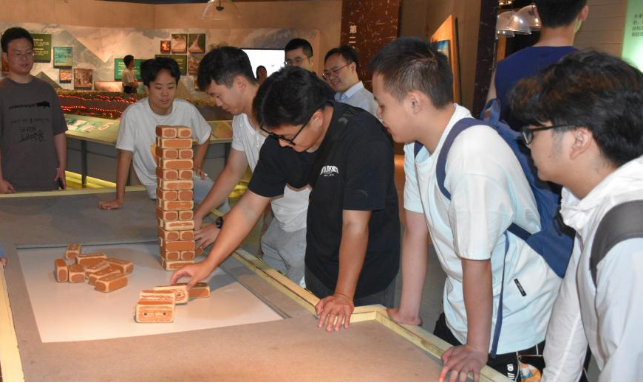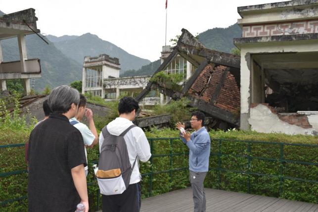在漩口中學遺址前,傾斜的教學樓、凝固的時鐘與殘垣斷壁無聲訴說著2008年那場震驚世界的地震災難。杜立兵老師現場剖析強震作用下建筑損毀痕跡與地震動特征,引導學生探討地震成因及抗震設計優化,將課堂理論融入抗災防災實踐。
