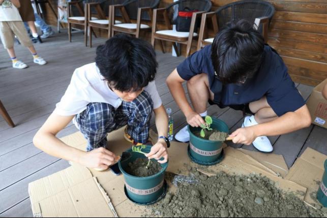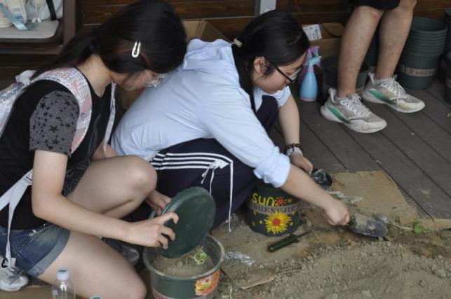 實(shí)踐環(huán)節(jié)以“手植希望,心沐陽(yáng)光”為主題,師生前往明辨樓三樓平臺(tái)開(kāi)展向日葵種植活動(dòng)。工作人員詳細(xì)講解選種、移栽、養(yǎng)護(hù)等知識(shí)后,同學(xué)們分組協(xié)作,小心翼翼地將幼苗移栽至花盆中。填土、壓實(shí)、澆水,每一步都飽含對(duì)生命成長(zhǎng)的期待。劉文軒同學(xué)在實(shí)踐后分享感悟說(shuō),“移栽需注意根系保護(hù)與土壤濕度,就像學(xué)習(xí)知識(shí)一樣,需細(xì)心呵護(hù)、循序漸進(jìn)。”活動(dòng)尾聲,師生為花盆貼上“成長(zhǎng)心愿卡”,將自己對(duì)生命成長(zhǎng)的期待和美好心愿寄托在小小的花盆上。隨后,大家抽取地科院原創(chuàng)心理情景劇《長(zhǎng)大》主題周邊 ——“小狗皮皮”情緒掛墜作為紀(jì)念品。