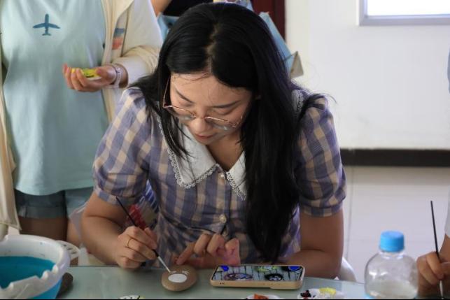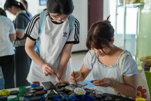 在巖石繪畫環(huán)節(jié)中,三校學(xué)生以展廳所見(jiàn)的巖石特征為靈感,在工作人員分發(fā)的巖石材料上進(jìn)行繪畫創(chuàng)作。創(chuàng)作過(guò)程中,同學(xué)們跨校交流創(chuàng)意,分享對(duì)“自然?科學(xué)?勞動(dòng)”的理解。不同學(xué)科背景的學(xué)生碰撞出獨(dú)特的火花,現(xiàn)場(chǎng)洋溢著學(xué)科交融的活力。大家用畫筆勾勒出對(duì)自然的熱愛(ài)、對(duì)科學(xué)的敬畏以及對(duì)勞動(dòng)的感悟,每一幅巖石畫都成為了同學(xué)們獨(dú)特創(chuàng)意的展現(xiàn)。
