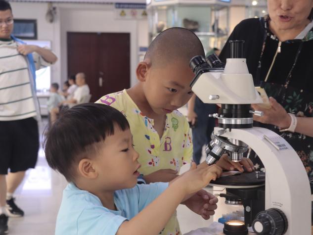 在講解結(jié)束后,孩子們來到觀測(cè)環(huán)節(jié),開啟了進(jìn)一步的探索。在近距離肉眼觀察環(huán)節(jié),孩子們仔細(xì)端詳著巖石的外觀細(xì)節(jié),努力發(fā)現(xiàn)每一個(gè)標(biāo)本不同尋常的地方。轉(zhuǎn)入微觀觀察時(shí),展廳配備的專業(yè)偏光顯微鏡構(gòu)建起"科學(xué)觀察站",孩子們將巖石薄片置于鏡下,探索肉眼無法觸及的微觀結(jié)構(gòu)與晶體排列。這種從厘米級(jí)到微米級(jí)的尺度跨越,讓孩子們直觀體會(huì)到"巖石記錄著地球46億年的記憶"這一地質(zhì)學(xué)核心命題。