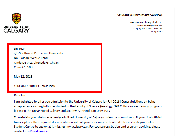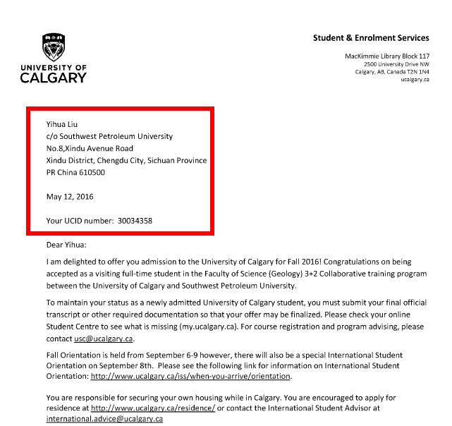 | 袁琳收到的卡爾加里大學(xué)的offer |