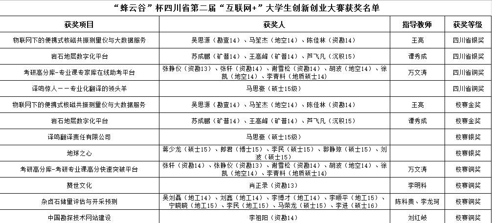 在本屆“互聯(lián)網(wǎng)+”大學生創(chuàng)新創(chuàng)業(yè)大賽省級決賽之前舉辦的西南石油大學校園選拔賽中,我院學生獲得金獎2項、銀獎2項、銅獎4項,地科院榮獲“優(yōu)秀組織獎”。