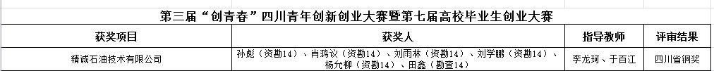 此外,在今年5月下旬舉辦的第三屆“創(chuàng)青春”四川青年創(chuàng)新創(chuàng)業(yè)大賽暨第七屆高校畢業(yè)生創(chuàng)業(yè)大賽中,地科院資源勘查工程2014級學生孫彪等6人的團隊創(chuàng)業(yè)項目——“精誠石油技術有限公司”經大賽專家評審榮獲四川省銅獎。
