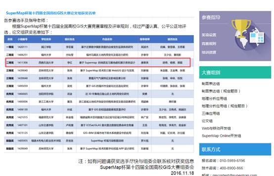 我院地理信息科學專業2013級學生代表隊(李紅、胡奇、楊柳、郭超)在唐章英老師的指導下獲得了第十四屆全國高校SuperMap杯GIS大賽二等獎的好成績。本屆全國高校GIS大賽也吸引了四川省內的其他高校參加,西南科技大學獲得了地理分析組三等獎一項;成都理工大學獲得了地理分析組優秀獎一項。