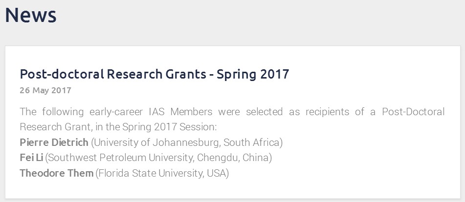 近日,從國際沉積學家協會(IAS)官網獲悉,我院青年教師李飛博士獲得2017年度春季博士后研究基金(Post-doctoral Research Grants)。該項基金在全球范圍內每年資助2批次,每批次不超過4名青年科技人員從事沉積學領域的創新研究工作。