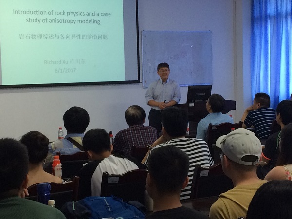 許川東博士首先對地球物理學科的發展及在石油行業的應用做了簡單的介紹,然后從影響因素、有效傳播介質、頁質砂巖的孔隙度與波速的關系、流體性質與滲透率等方面詳細介紹了如何通過巖石物理學建立地下模型,并通過實例研究闡明了構建各向異性模型的過程。講座結束后,與會師生就報告內容與許川東博士進行了交流討論。(圖/王晨晨 文/王琳玲)