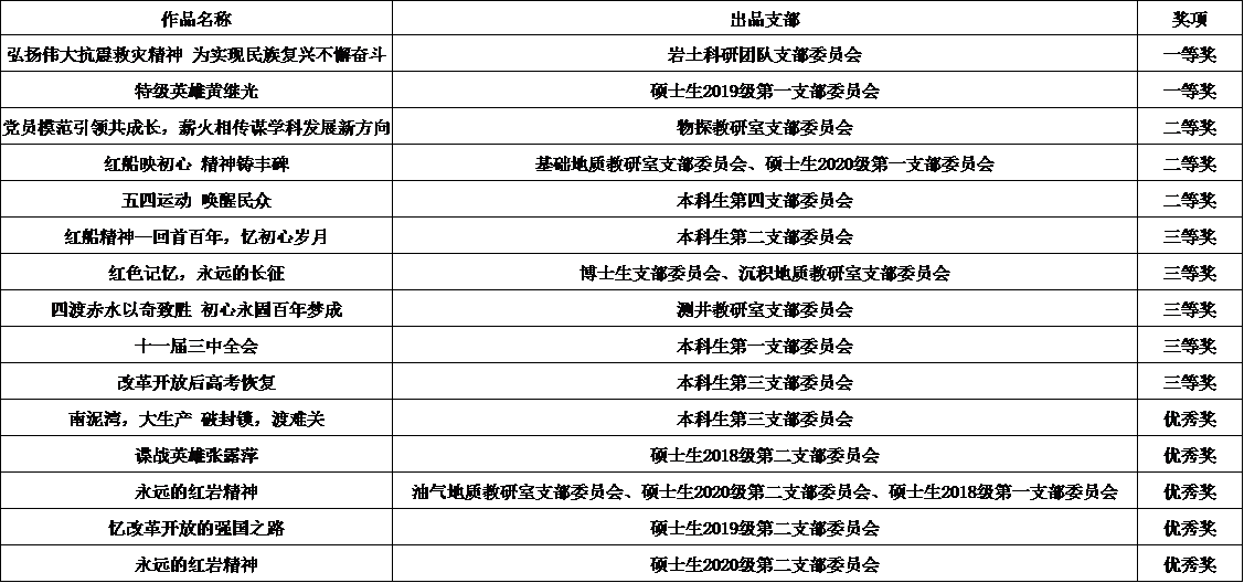 根據《關于開展2021年地科院黨支部書記、優秀黨員講黨史微課比賽的通知》要求,學院黨委于2021年4月-9月組織開展師生黨支部書記、優秀黨員講黨史微課比賽活動,我院黨委組織學校黨委組織部、學生工作部(處)以及學院領導、學院教授委員會對15件作品進行評議打分,根據最終意見形成評獎結果如下: