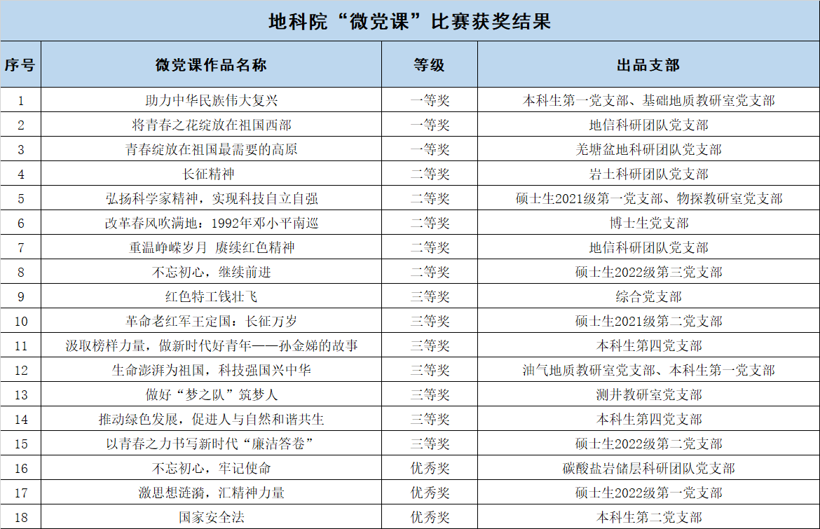 為深入學習貫徹習近平新時代中國特色社會主義思想和黨的二十大精神,以賽促學、以學促行,引導廣大師生厚植愛黨愛國愛校情懷,推動組織生活載體、內容和形式再創新,推動黨的創新理論入耳入腦入心入行,按照學院黨建提質增效行動工作安排,我院于2023年4月10日啟動2023年“微黨課”和“優秀案例”比賽活動。我院黨委聯系學校組織部、宣傳部、學工部及學院領導、老師對“微黨課”和“優秀案例”進行評議打分,形成評獎結果,經過3個工作日的公示,最終結果如下: