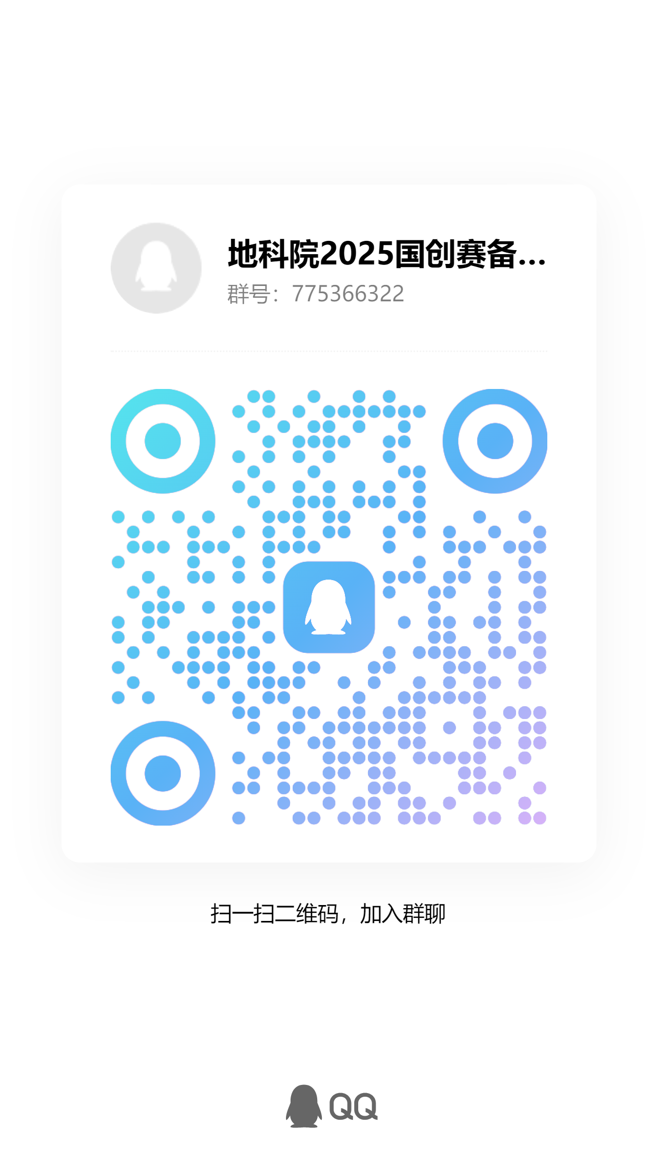 請(qǐng)掃描二維碼加入“地科院2025國(guó)創(chuàng)賽備賽群”,并于11月12日前填寫(xiě)群內(nèi)發(fā)布的報(bào)名表。