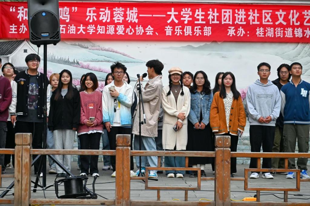 為深入學習貫徹習近平新時代中國特色社會主義思想,踐行黨的二十大精神,充分發揚石大學子熱愛志愿服務、投身基層實踐的優良傳統。11月2日,西南石油大學知源愛心協會攜手音樂俱樂部于桂湖街道錦水苑社區開展“和聲共鳴”樂動蓉城——大學生社團進社區文化藝術節志愿服務活動。知源愛心協會成員馬瑛、張曜琳主持活動,湖街道錦水苑社區居民自發積極參與。
