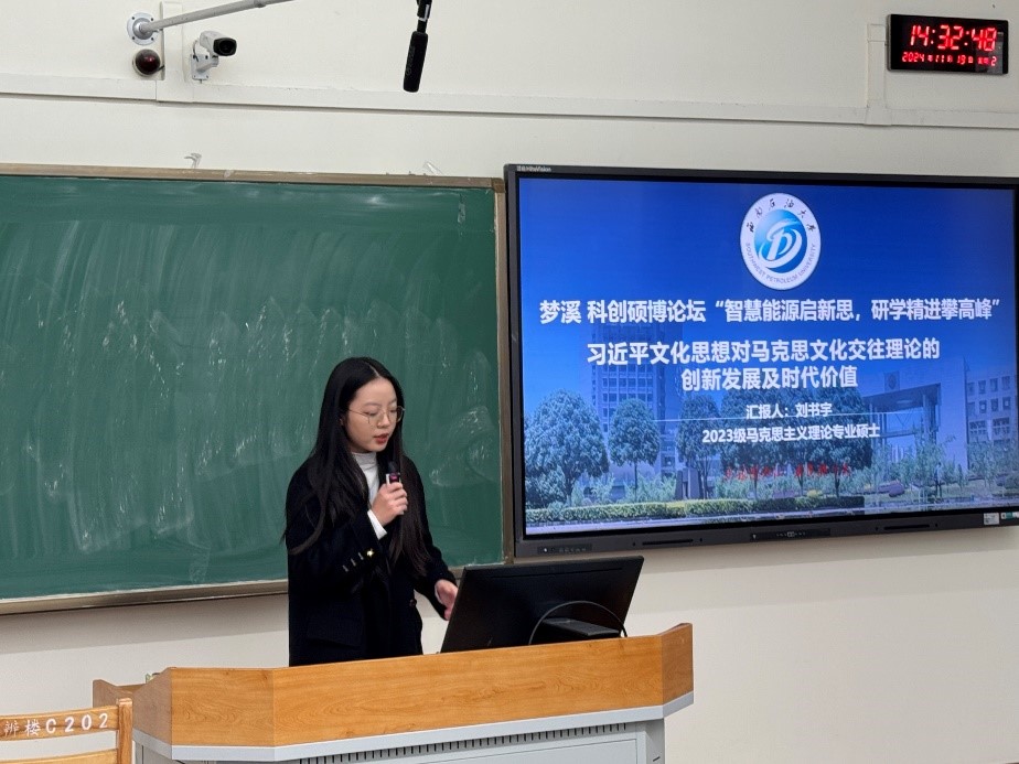 馬克思主義理論專業(yè)2023級(jí)碩士研究生劉書宇首先作了題為《習(xí)近平文化思想對(duì)馬克思文化交往理論的創(chuàng)新發(fā)展及時(shí)代價(jià)值》的報(bào)告。她從馬克思文化交往理論的基本框架切入,結(jié)合習(xí)近平文化思想的發(fā)展脈絡(luò),深入剖析了理論創(chuàng)新的具體表現(xiàn)及其對(duì)當(dāng)代社會(huì)文化發(fā)展的引領(lǐng)作用。通過(guò)細(xì)致的案例剖析,她闡釋了文化交往理論在全球化中的重要實(shí)踐意義,并提出文化領(lǐng)域理論與實(shí)踐結(jié)合的新方向。